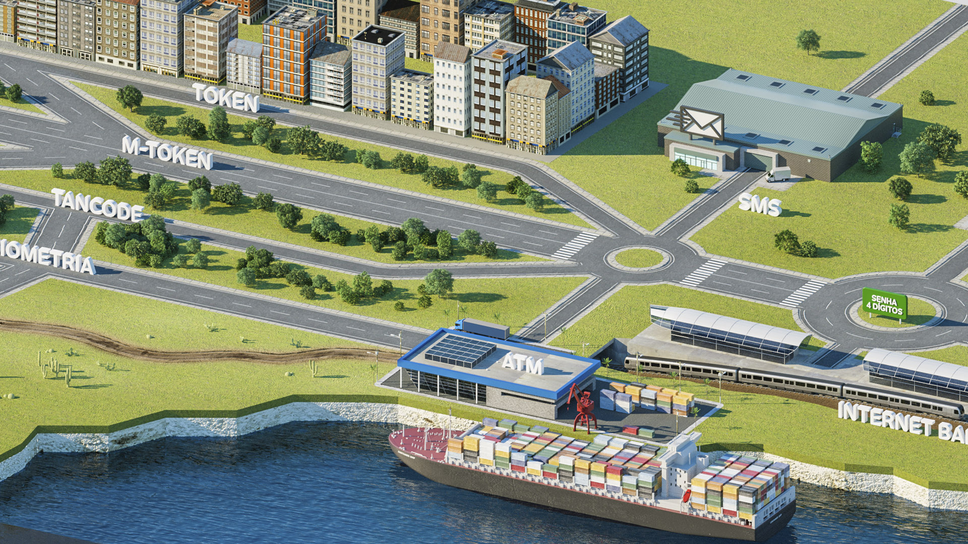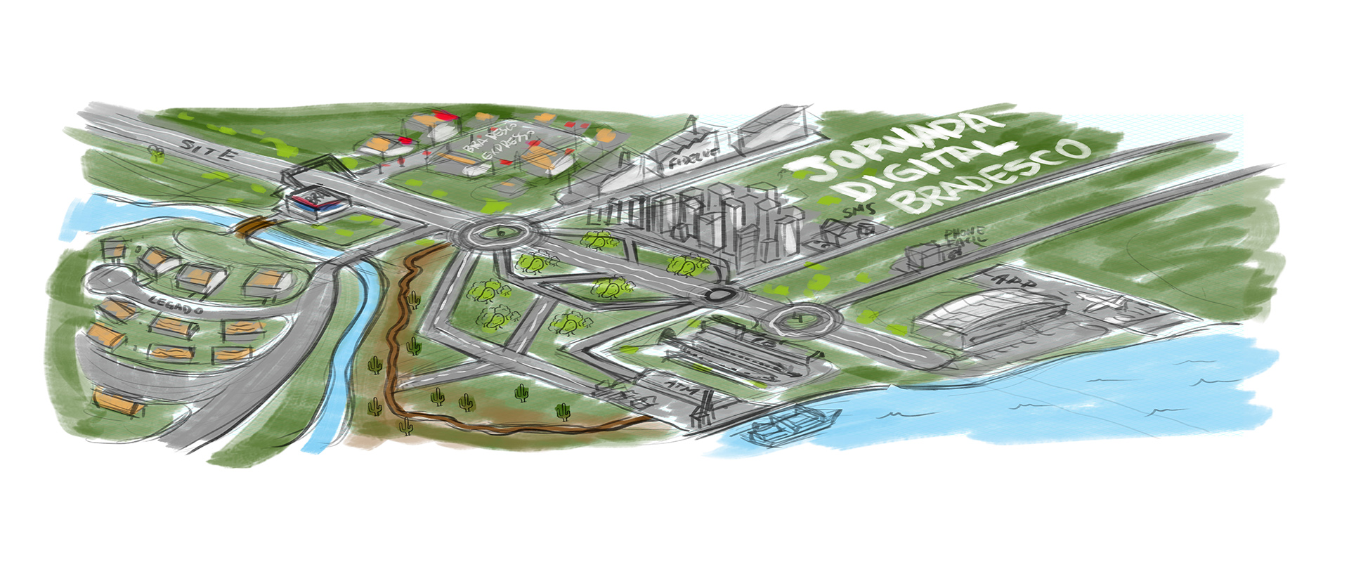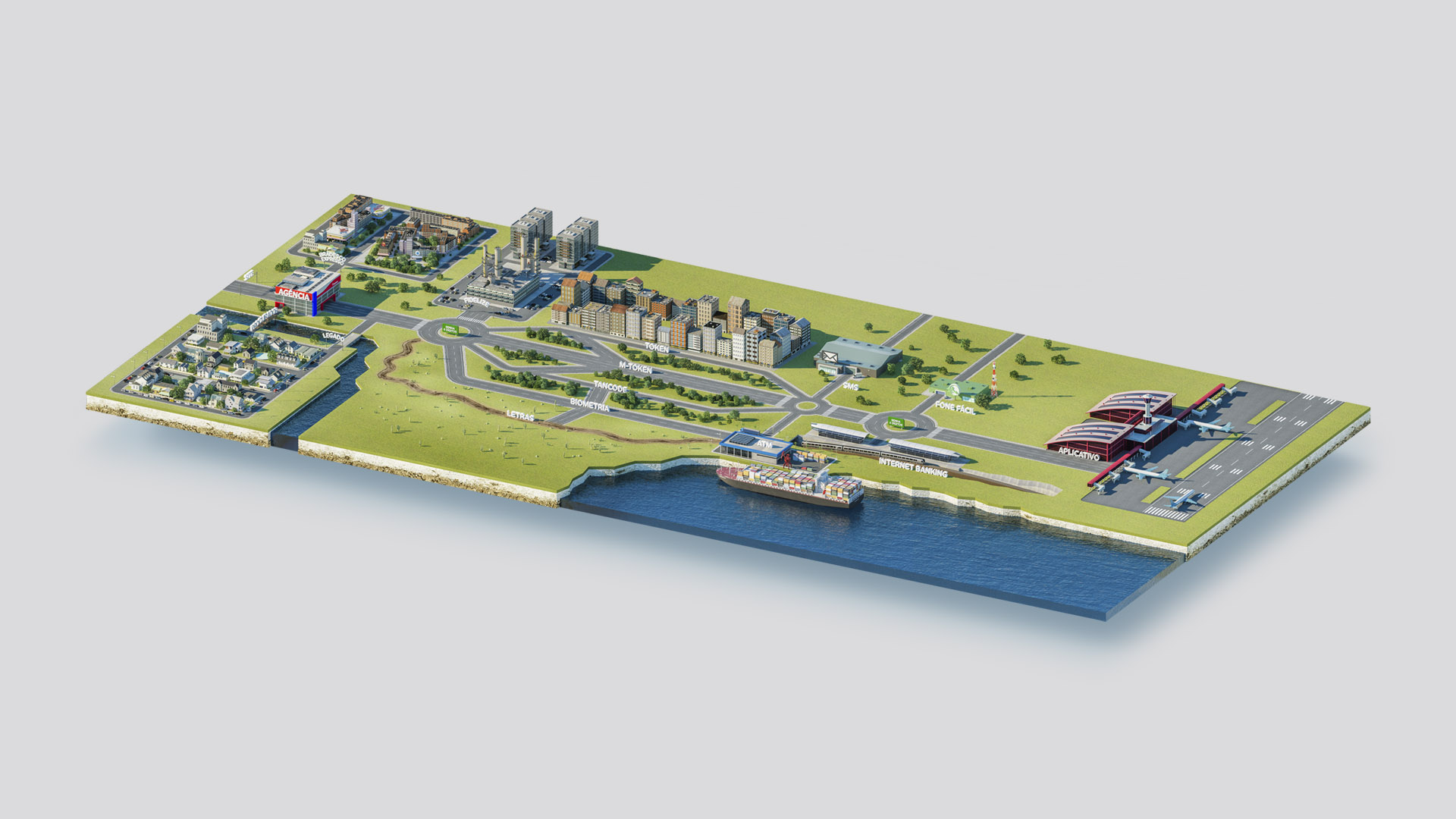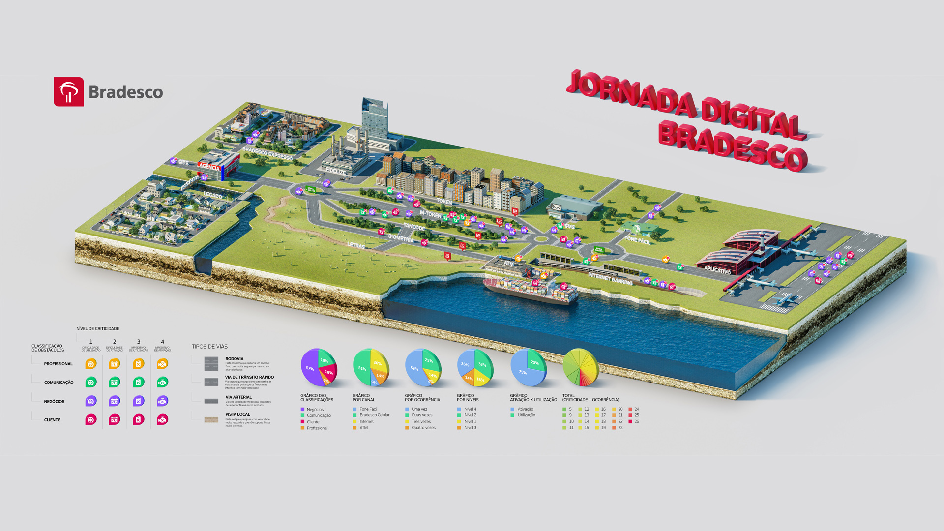 Trabalho de criação e desenvolvimento de mapa ilustrado em 3D para os Serviços Bradesco.